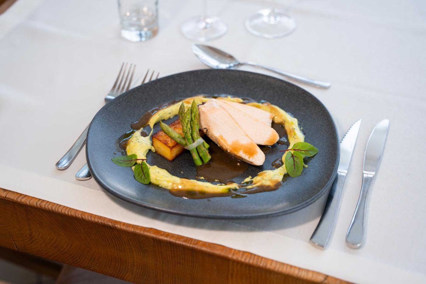 → Main course: chicken (sous vide), wild garlic cream, potato pavé, marinated asparagus, clear porcini mushroom sauce