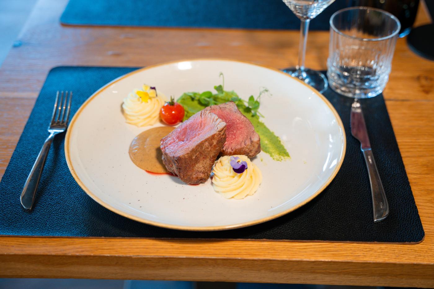 → Glavna jed: goveji file z omako iz jurčkov, postrežen na žametni kremi mlade zelene soje (edamame), in krompirjev pire