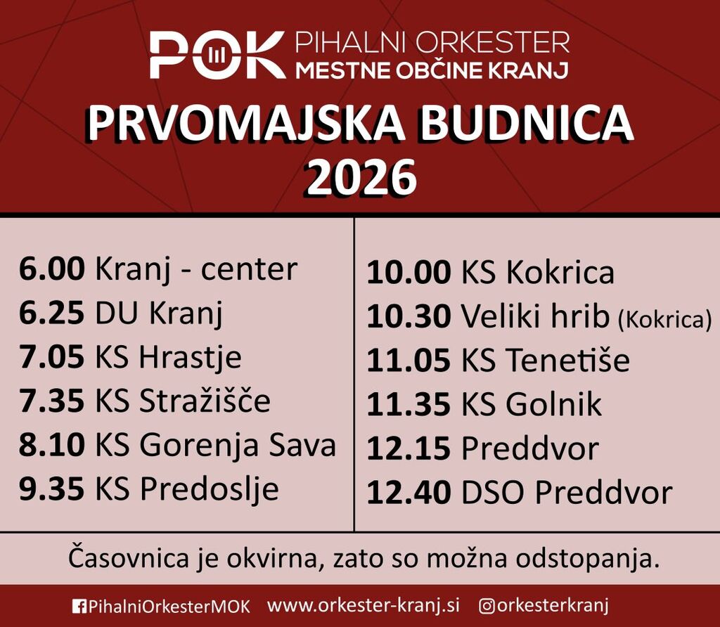 Tradicionalna prvomajska budnica Pihalnega orkestra Mestne občine Kranj. Pihalni orkester Mestne občine Kranj bo tudi letos obeležil praznik dela s tradicionalno prvomajsko budnico. V petek, 1. maja 2…